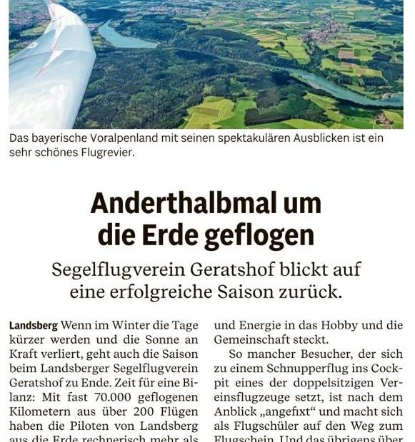 Wenn im Winter die Tage kürzer werden und die Sonne an Kraft verliert, geht auch die Saison beim Landsberger Segelflugverein Geratshof zu Ende. Zeit für eine Bilanz: Mit fast 70.000 geflogenen Kilometern aus über 200 Flügen haben die Piloten von Landsberg aus die Erde rechnerisch mehr als anderthalb Mal umrundet. Damit rangiert der Verein unter den Top Ten in Bayern.